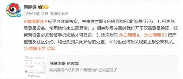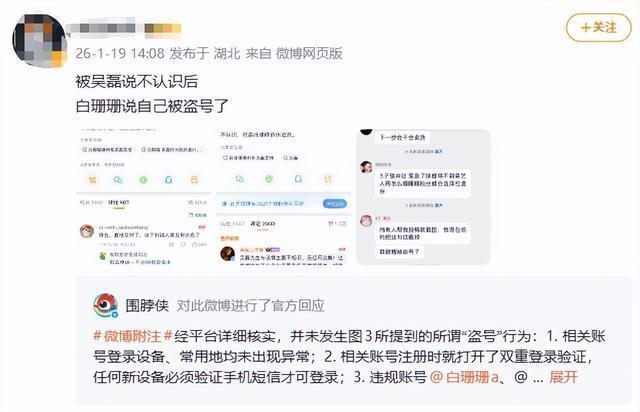 1月19日,有网友举报“被吴磊说不认识后,白珊珊说自己被盗号了”相关内容,@围脖侠发文回应:经平台详细核实,并未发生图3所提到的所谓“盗号”行为:1. 相关账号登录设备、常用地均未出现异常;2. 相关账号注册时就打开了双重登录验证,任何新设备必须验证手机短信才可登录;3. 违规账号@白珊珊a、@白珊珊83已严重违反社区公约,均已受到关闭账号的处置,平台也已将相关线索上报公安机关。
