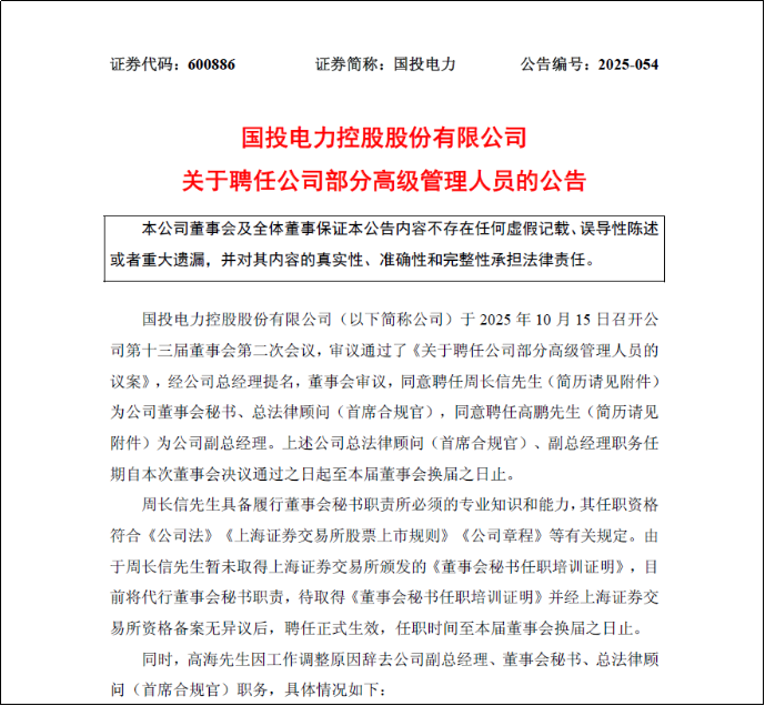 10月15日,国投电力控股股份有限公司(以下简称“国投电力”,SH:600886)发布公告,经公司总经理提名,第十三届董事会第二次会议审议,同意聘任周长信为公司董事会秘书、总法律顾问(首席合规官),同意聘任高鹏为公司副总经理,相关职务任期自本次董事会决议通过之日起至本届董事会换届之日止。