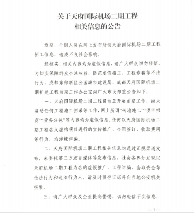 1月15日,成都东部新区公园城市建设局与成都天府国际机场二期扩建工程前期工作办公室联合发布《关于天府国际机场二期工程相关信息的公告》,其中提到,近期,个别人员在网上发布所谓天府国际机场二期工程招工信息,造成不良社会影响。经核实,相关内容均为虚假信息,请广大群众切勿轻信。